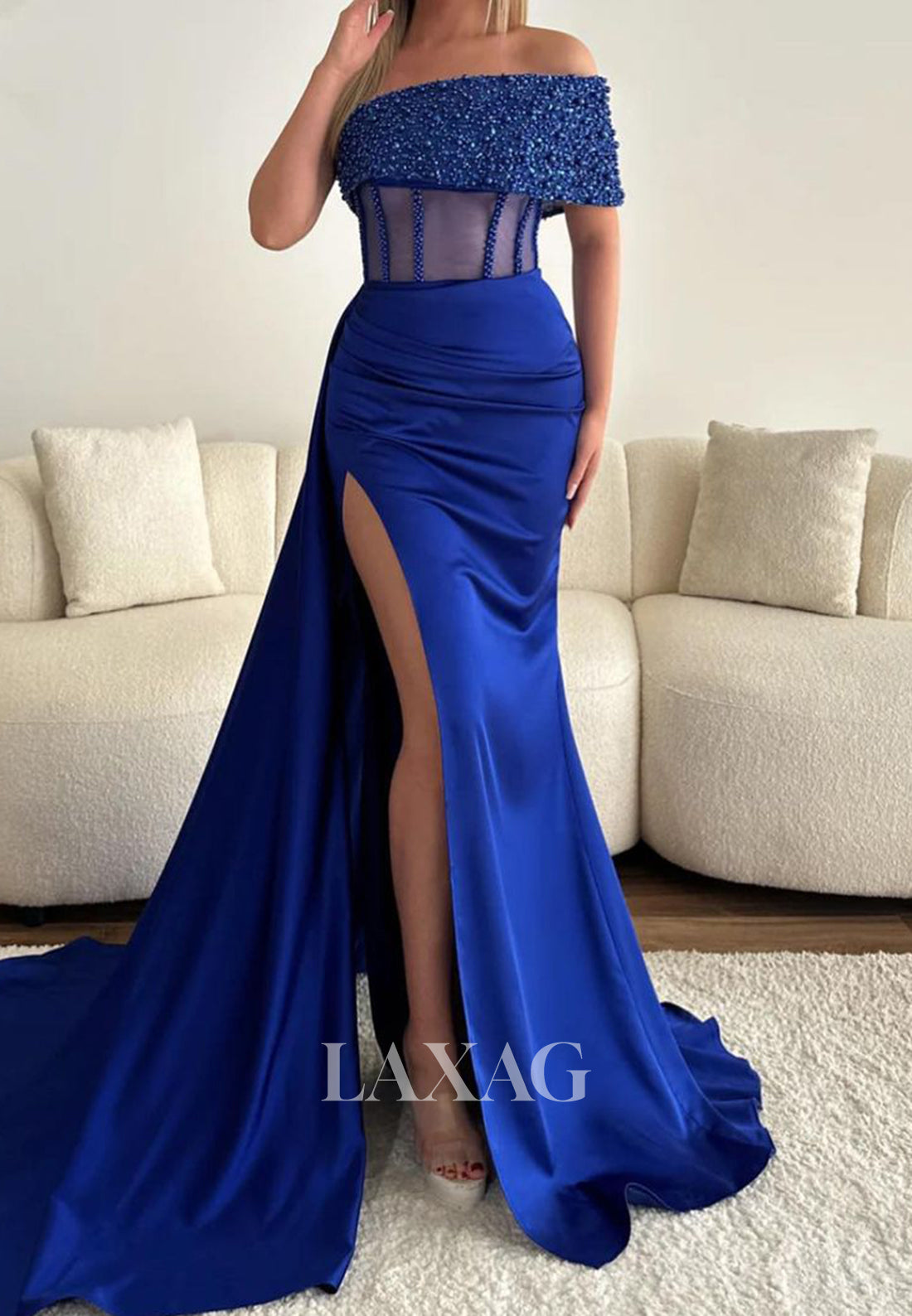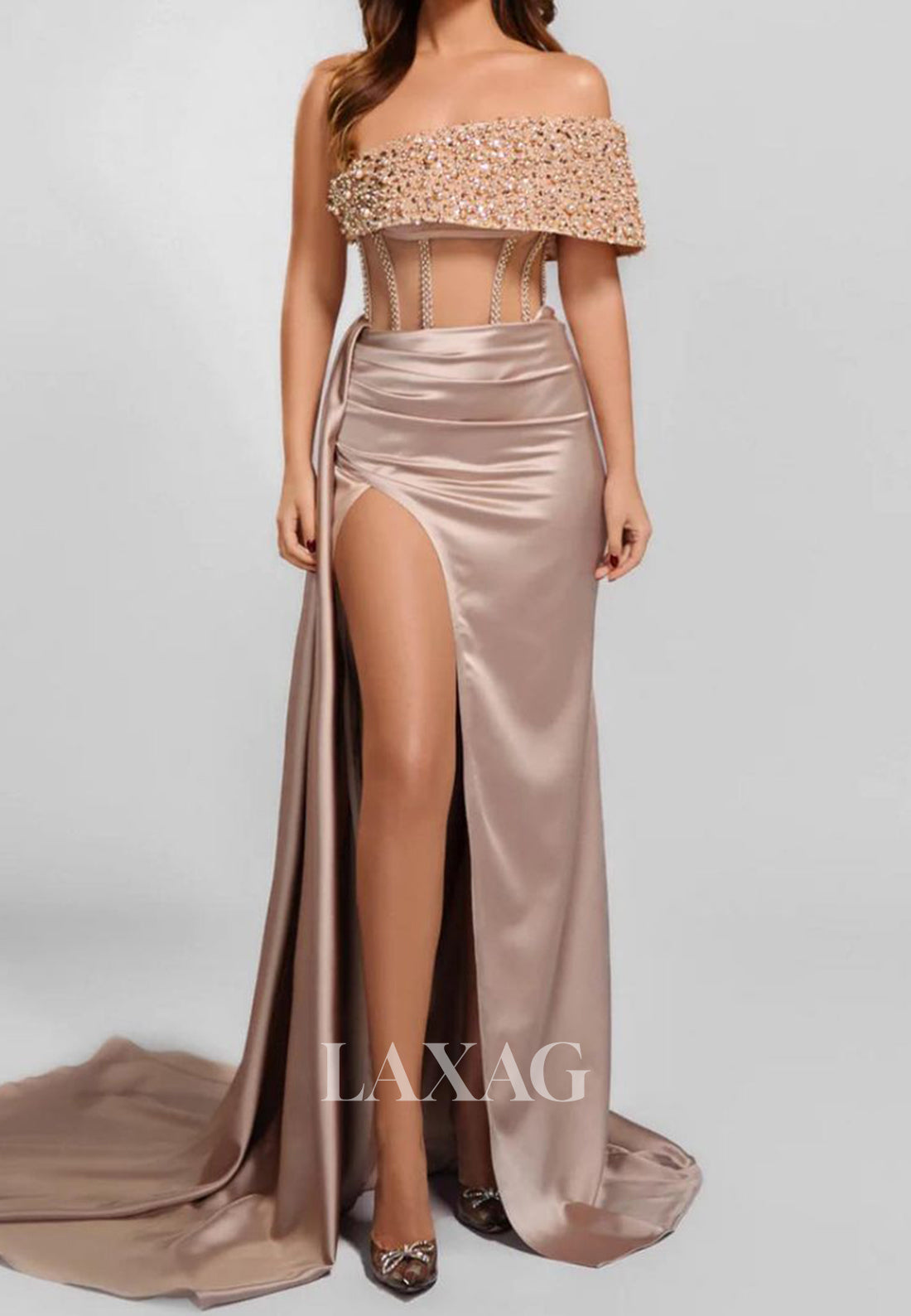 Take their breath away in this stunning Off-Shoulder Tube Top Beaded Pleated Satin Party Gowns. The intricate beading and pleating details will make you shine all night long. With a high slit and mermaid cut, this dress is perfect for showing off your curves. Elevate any prom or special occasion with this elegant and stylish dress.