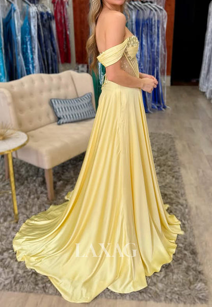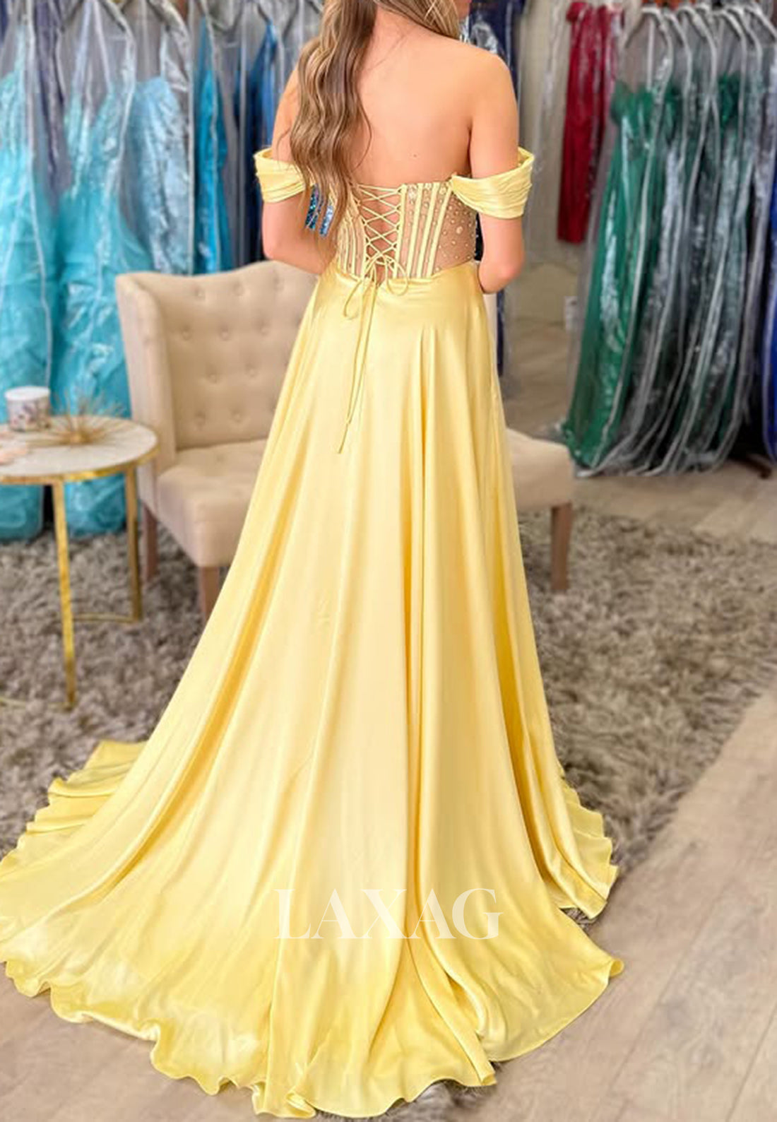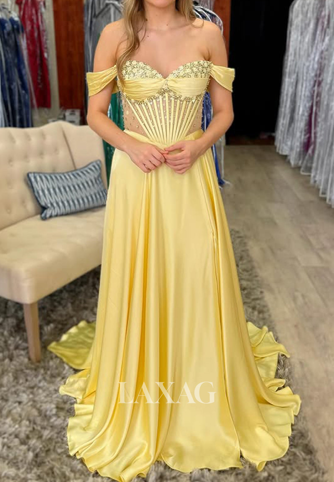 Sweetheart Off-Shoulder Sleeveless Beaded Pleated Sheer Satin Fitted Prom Dress with Sweep Train