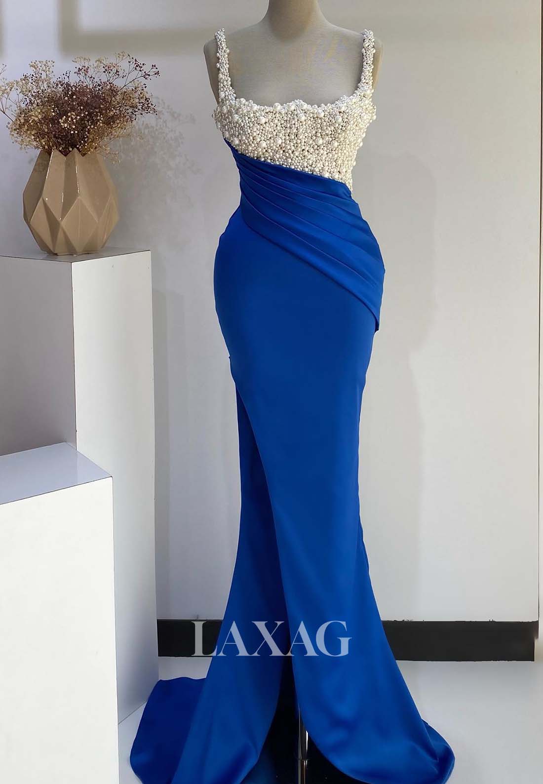 Sweetheart Spaghetti Straps Pleated Mermaid Evening Gowns Sleeveless Beaded Satin Formal Gowns