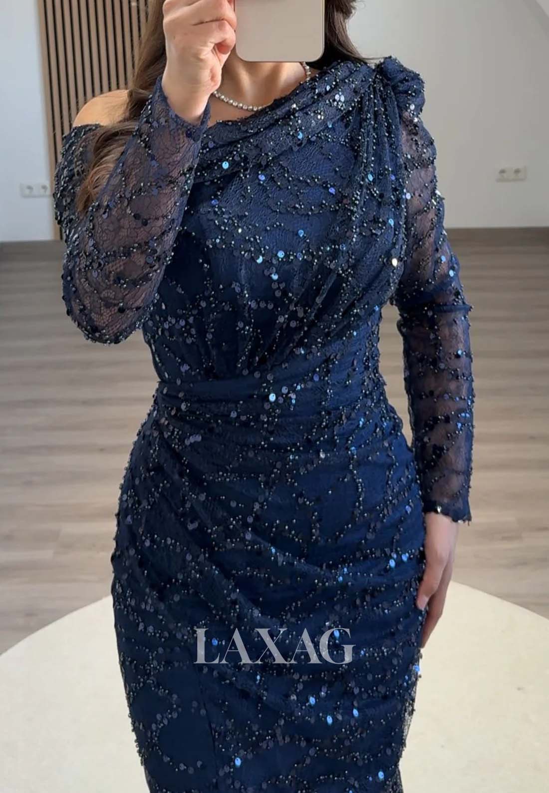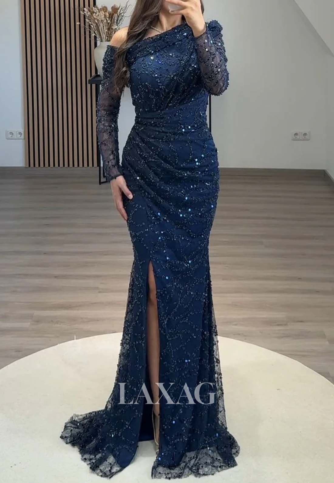 Asymmetrical-Neck Long-Sleeves Pleated Mermaid Evening Dress Fully Sequined Beaded Formal Gowns