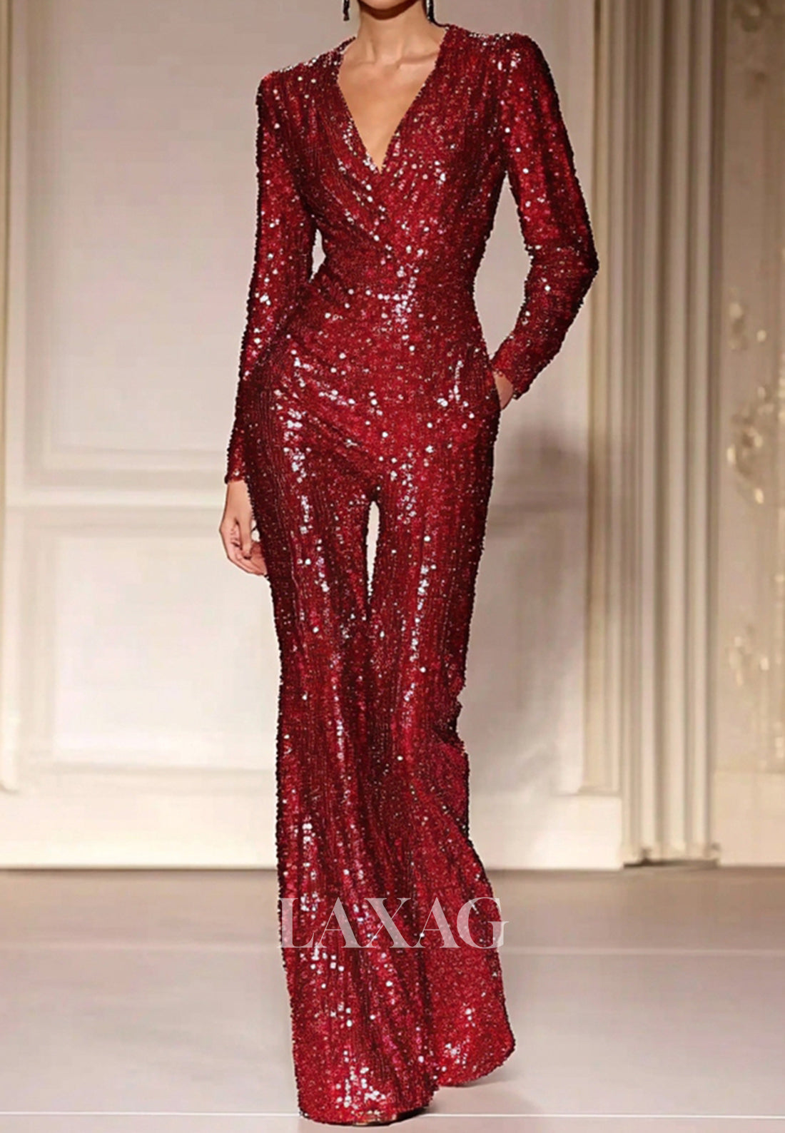 Long-Sleeves Deep V-Neck Fully Sequined Pleated Jumpsuit