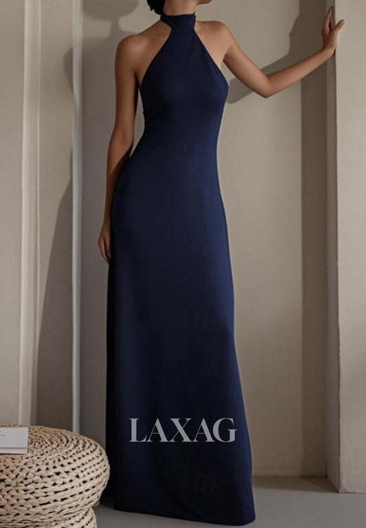 Halter-Neck Off-Shoulder Satin Evening Gowns Simple Sleeveless Floor-Length Fitted Wedding Guest Dress