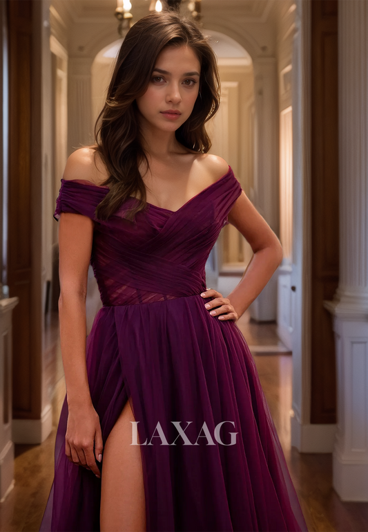 V-Neck Sleeveless Tulle A-Line Prom Dress Off-Shoulder Pleated High Slit with Train Formal Party Gowns