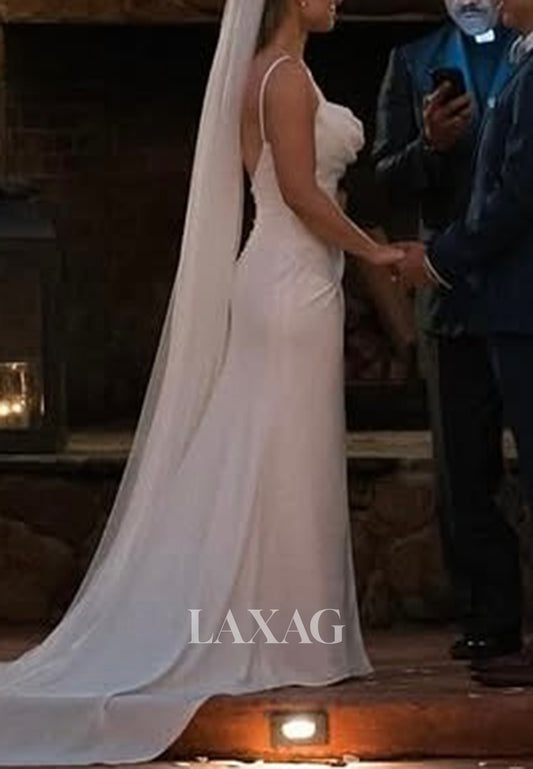 V-Neck Spaghetti Straps Off-Shoulder Sleeveless Pleated Mermaid Wedding Dress with Sweep Train