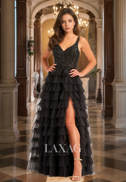 V-Neck Spaghetti Straps Off-Shoulder Sleeveless A-Line Prom Dress Beaded Applique Tiered Tulle Party Gowns