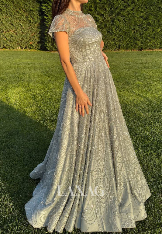 High-Neck Fully Sequined Beaded Evening Gowns Cap-Sleeves Satin Floor-Length A-Line Prom Dress