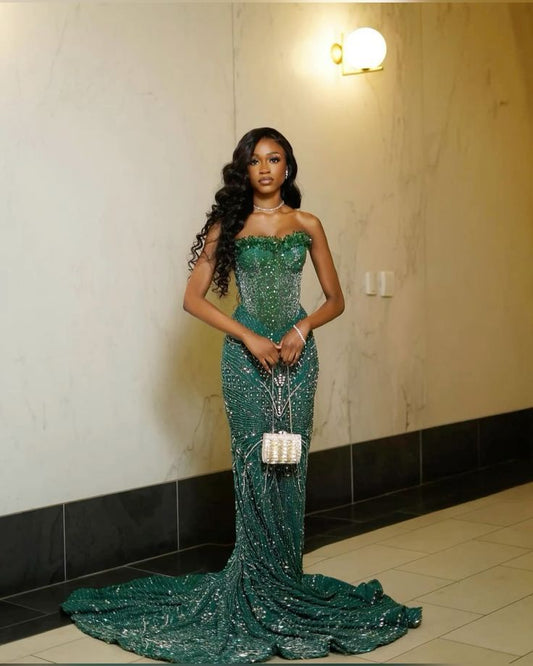 Tube Top Floor-Length Chiffon Pleated Mermaid Prom Dress Fully Sequined Beaded Evening Gowns