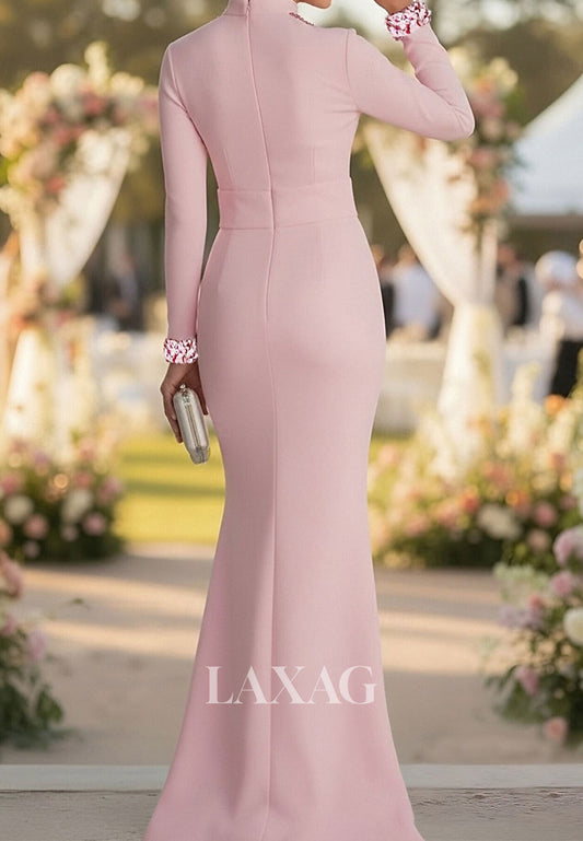 High-Neck Long-Sleeves Sequined Satin Cutout Floor-Length Mermaid Evening Dress