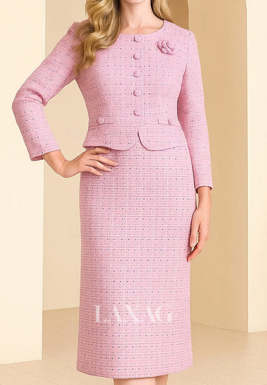 Scoop-Neck Long-Sleeves 3D-Floral Satin Tea-Length Mermaid Mother of the Bride Dress