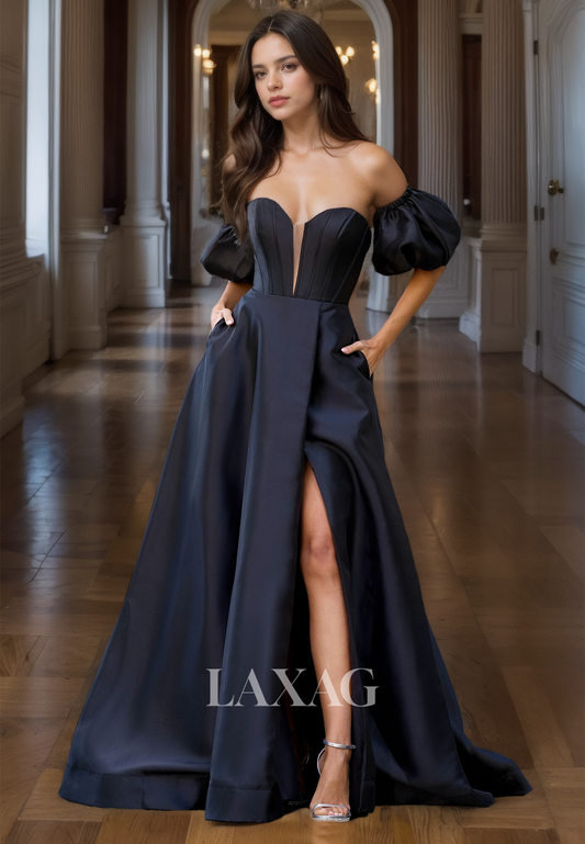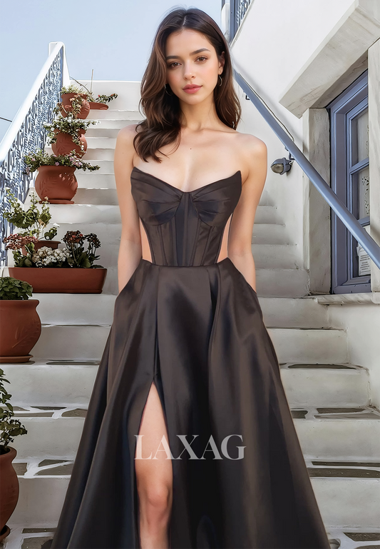 Off-Shoulder Sweetheart Sleeveless Satin Formal Gowns Pleated Cutout High Slit A-Line Prom Dress