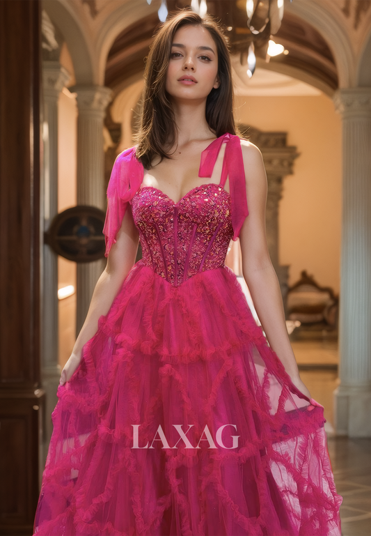 A-Line Sweetheart Sleeveless Pleated Evening Gowns Glitter-Lace Applique Tiered Prom Dress with High Slit
