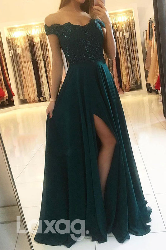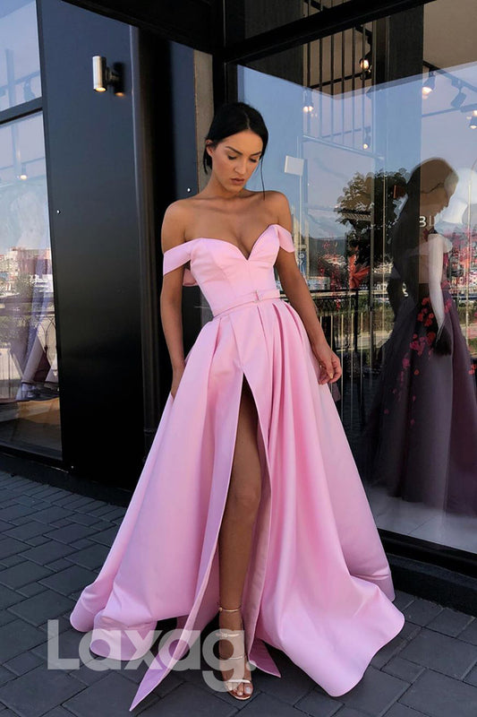 16712 - Off the Shoulder High Split A-line Formal Dress