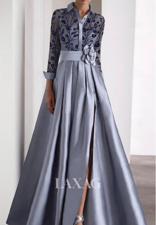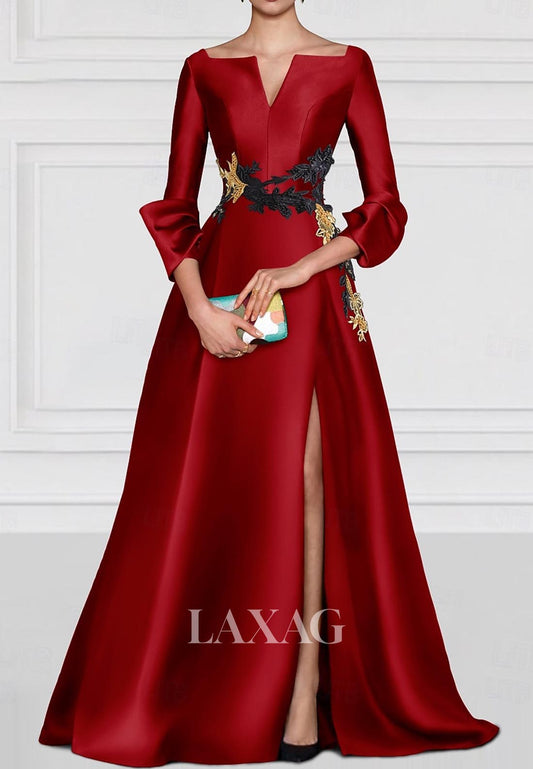 V-Neck Long-Sleeves Satin A-Line Evening Dress Beaded Embroidered Formal Gowns with High Slit