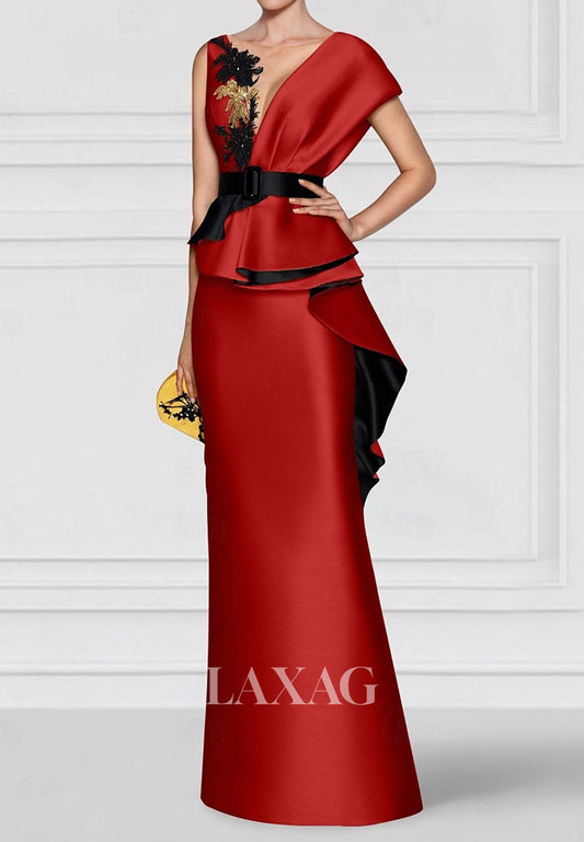V-Neck Half-Sleeves Pleated Party Gowns Applique Embroidered Mermaid Wedding Guest Dress with Overskirt