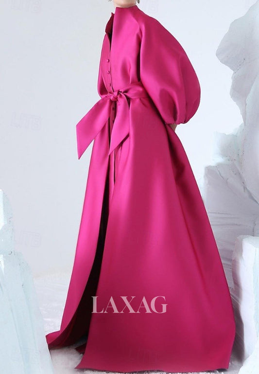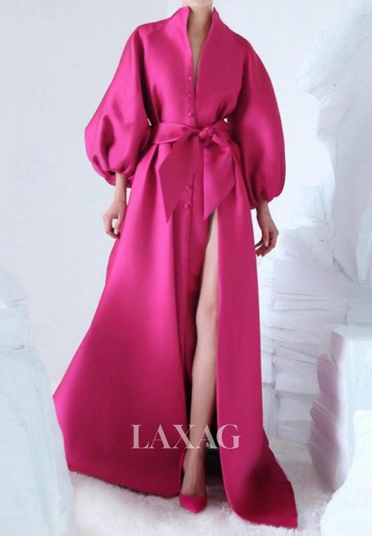 Long-Puff-Sleeves V-Neck Pleated High Slit Satin A-Line Flormal Evening Dress with Sweep Train