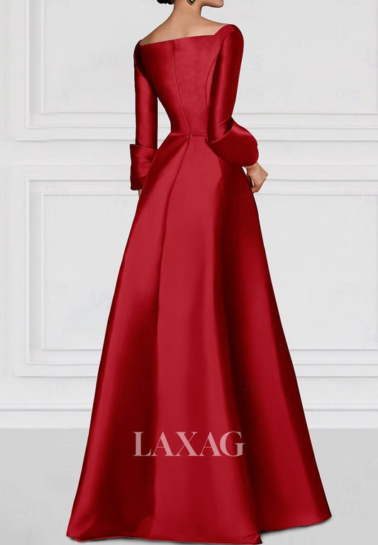 Asymmetrical-Neck Long Sleeves Evening Gowns Pleated Floor-Length Two Tone Satin A-Line Wedding Guest Dress
