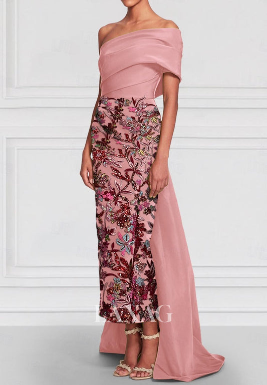 Asymmetrical-Neck Ankle-Length Mermaid Evening Gowns Floral Embroidered Sequined Formal Gowns
