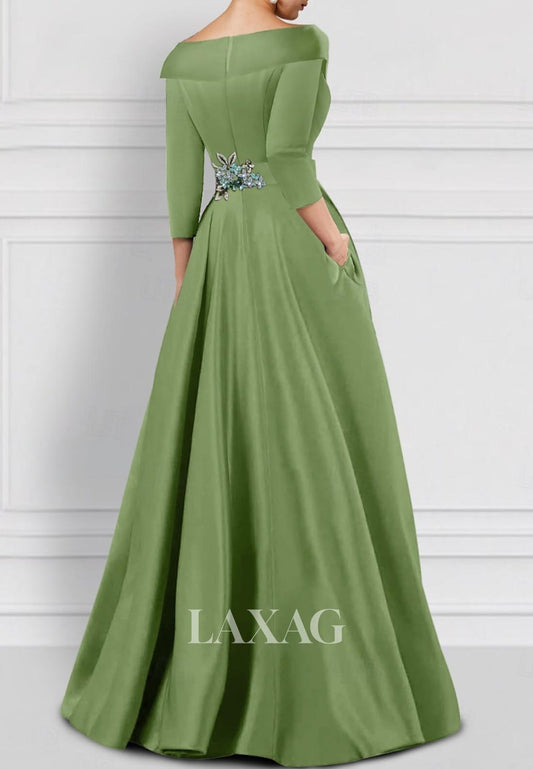 22499 - Boat Neack Long Sleeves Beaded Pearls Sleek Satin Mother of the Bride Dress