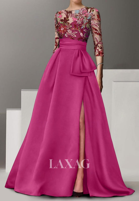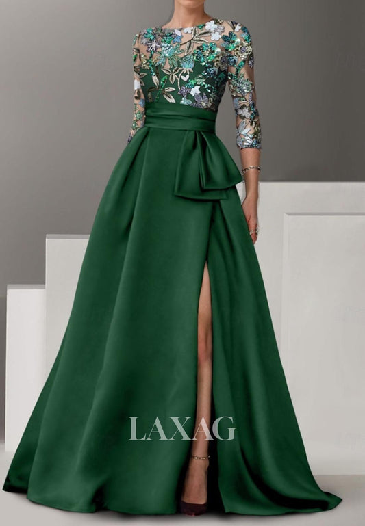 22692 - Bateau Quarter Sleeves Appliques Mermaid Mother of the Bride Dress with Slit