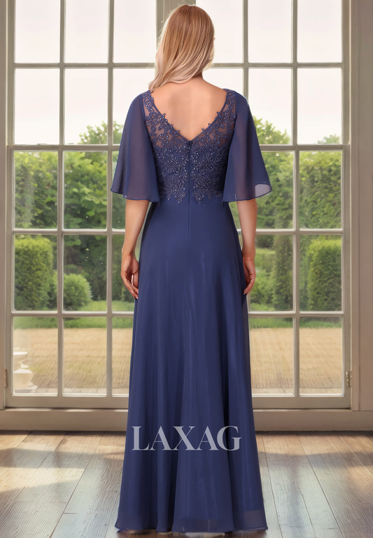 A-Line V-Neck Half Sleeves Appliqeus Chiffon Mother of the Bride Dress