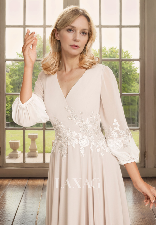 A-Line V-Neck Long Sleeves Appliques Chiffon Mother of the Bride Dress