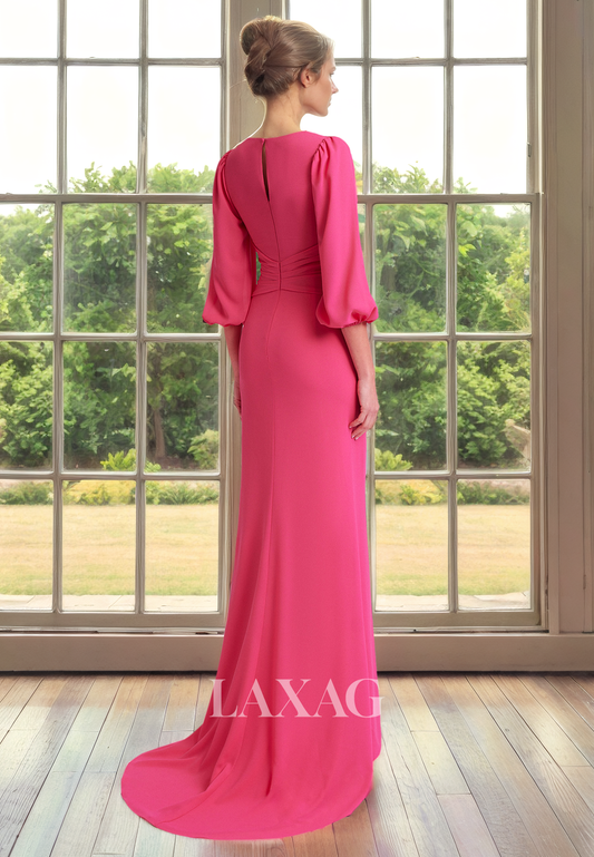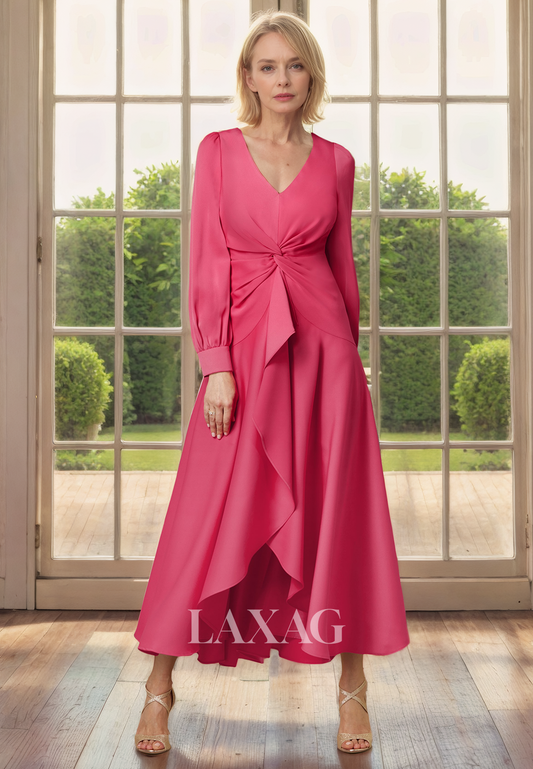 V-Neck Long Sleeves Sleek Satin Elegant Mother of the Bride Dress with Train