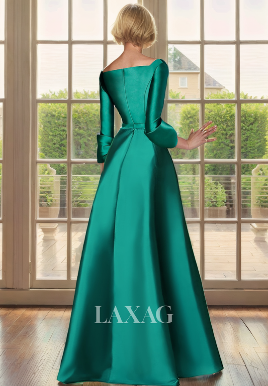 Off Shoulder Quarter Sleeves Sleek Satin Mother of the Bride Dress with Slit