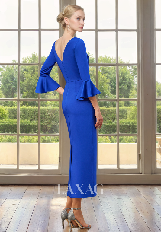 A-Line V-Neck Quarter Sleeves Sleek Satin Mother of the Bride Dress with Slit