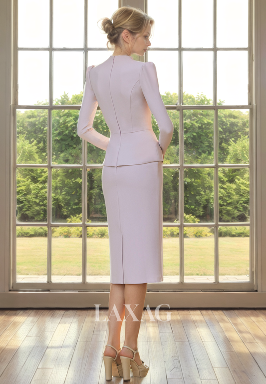 V-Neck Long Sleeves Sleek Satin Knee-Length Mother of the Bride Dress