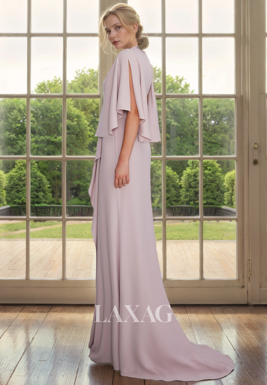 V-Neck Sleeves Chiffon Elegant Mother of the Bride Dress with Train