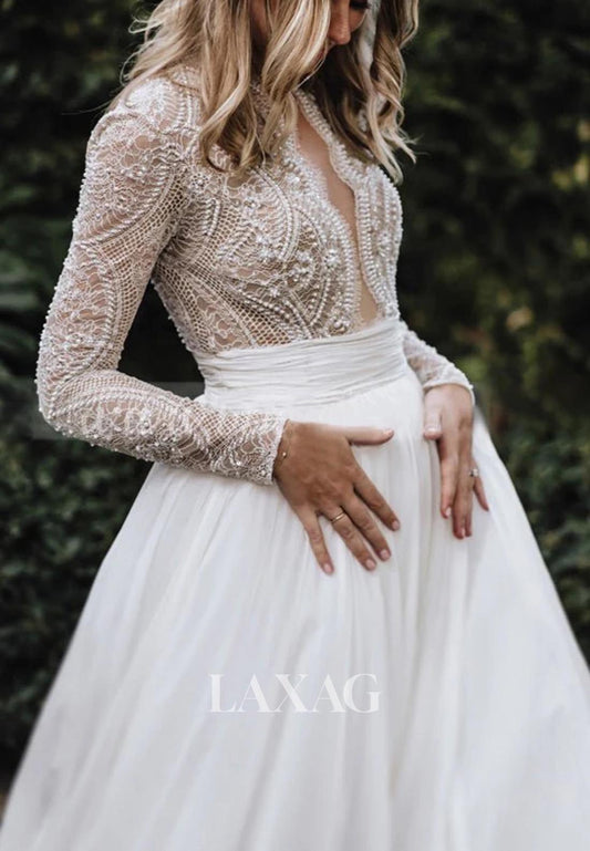 Deep V-Neck Long-Sleeves Beaded Bride Gowns Applique Pleated Tulle A-Line Wedding Dress