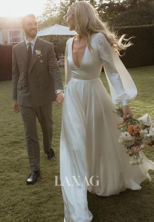 Simple V-Neck Long-Sleeves Pleated Satin A-Line Wedding Dress with Sweep Train