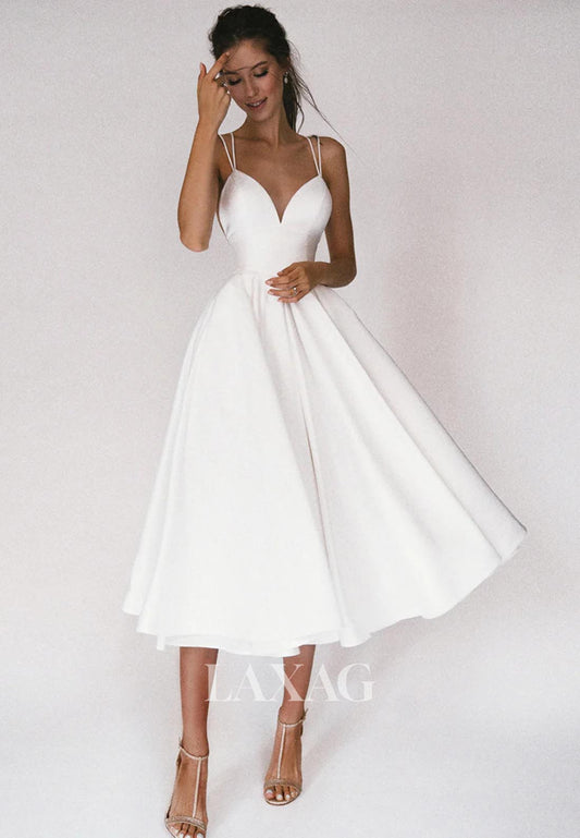 Simple V-Neck Spaghetti Straps Sleeveless Pleated Satin A-Line Wedding Dress with Sweep Train