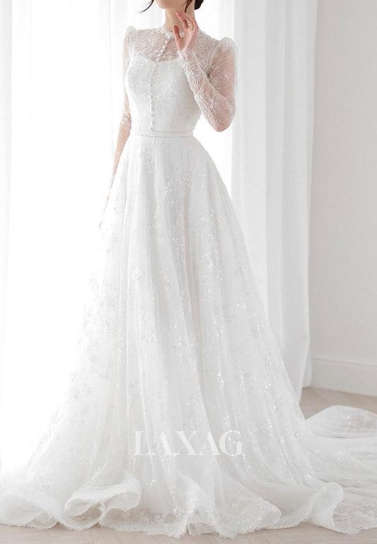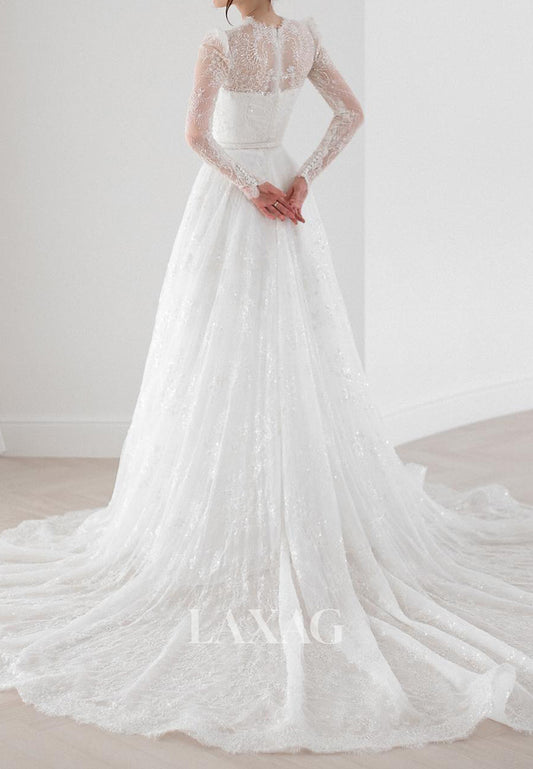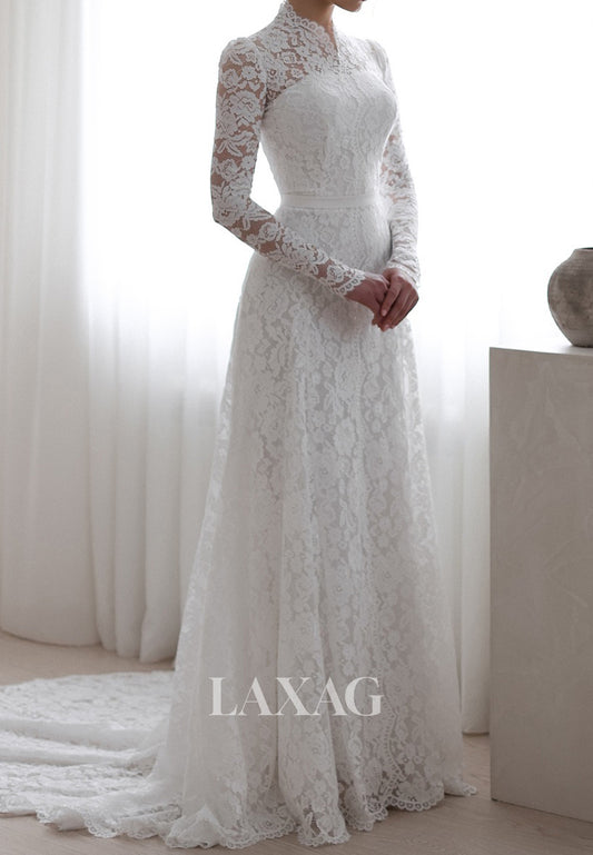 High-Neck Allover Lace Bride Gowns Long-Sleeves Sheer Pleated A-Line Wedding Dress with Train