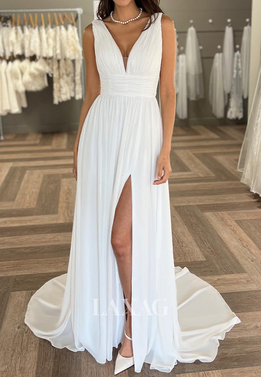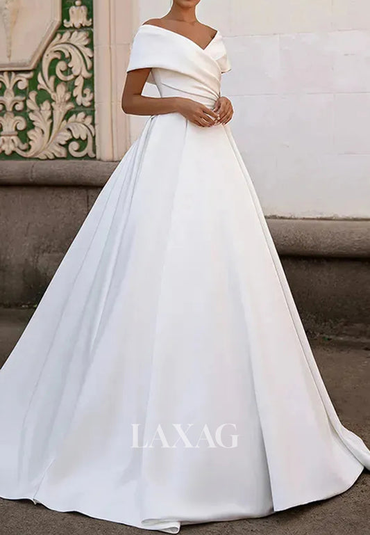 V-Neck Sleeveless A-Line Wedding Dress Off-Shoulder Pleated Satin Bride Gowns with Train