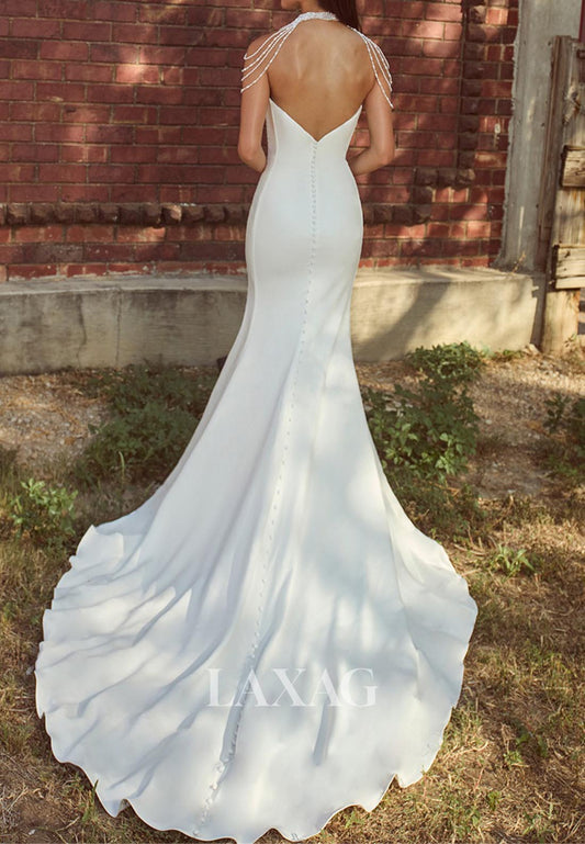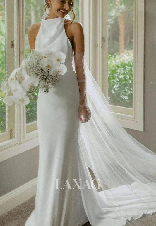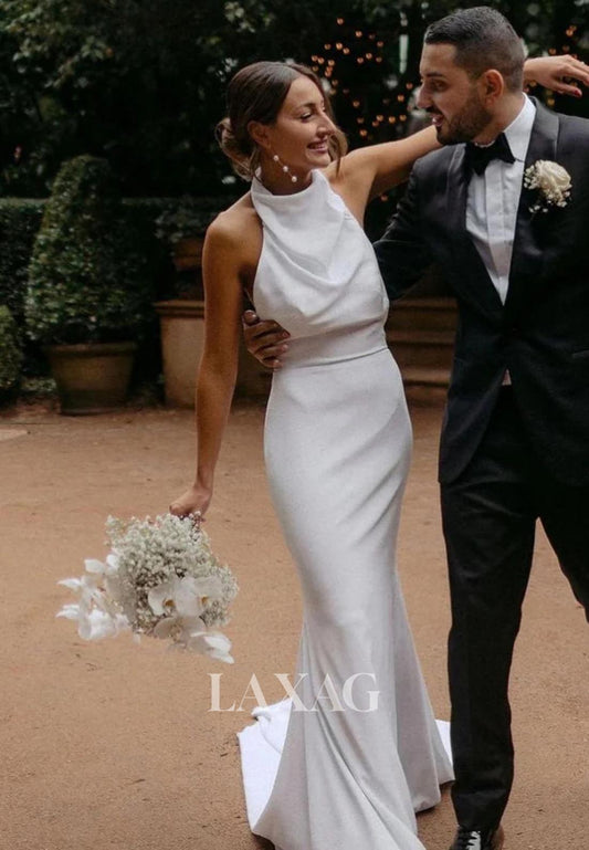 Halter Asymmetrical-Neck Sleeveless Floor-Length Pleated Satin Mermaid Wedding Dress with Train