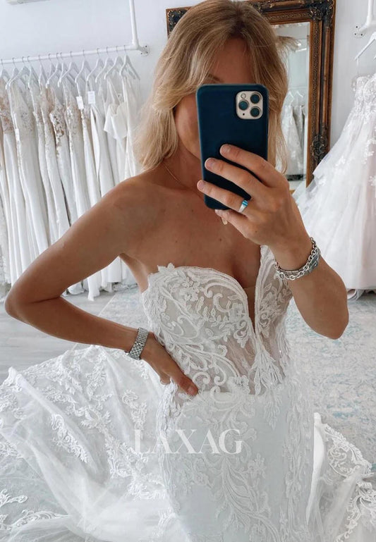 Sweetheart Allover Lace Applique Bride Gowns Sleeveless Sweep Train Mermaid Wedding Dress