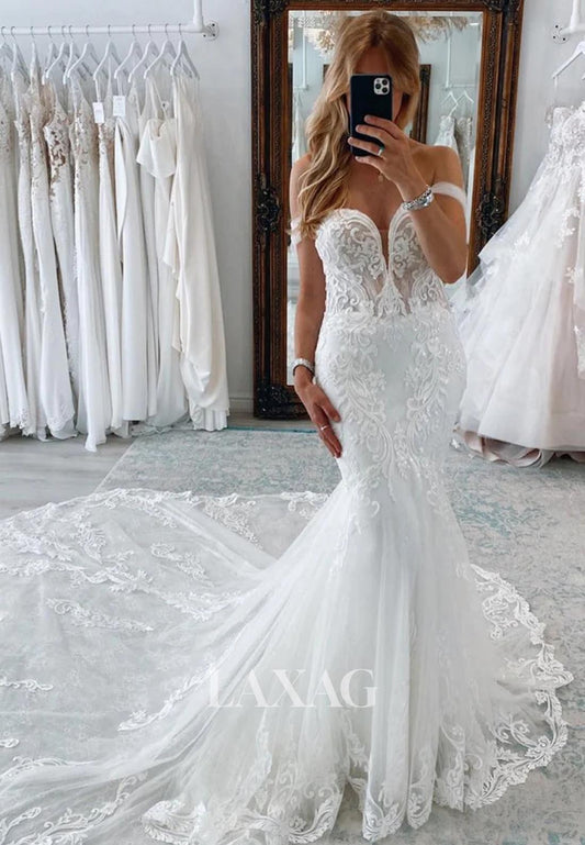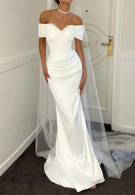 Sweetheart Off-Shoulder Mermaid Wedding Dress Applique Beaded Pleated Chiffon Bride Gowns