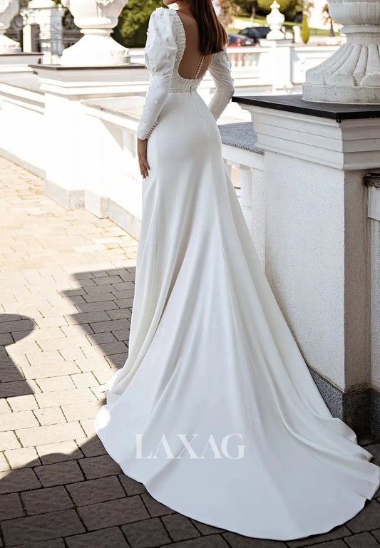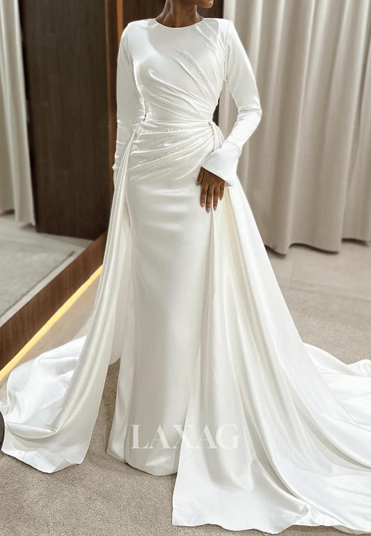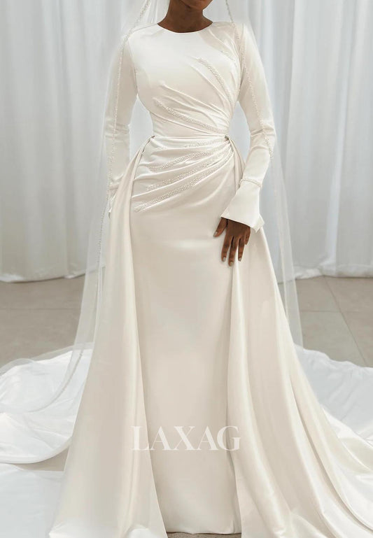 Scoop-Neck Long-Sleeves Beaded Pleated Satin Mermaid Wedding Dress with Removable Train