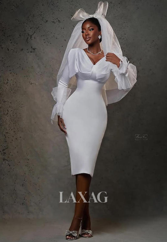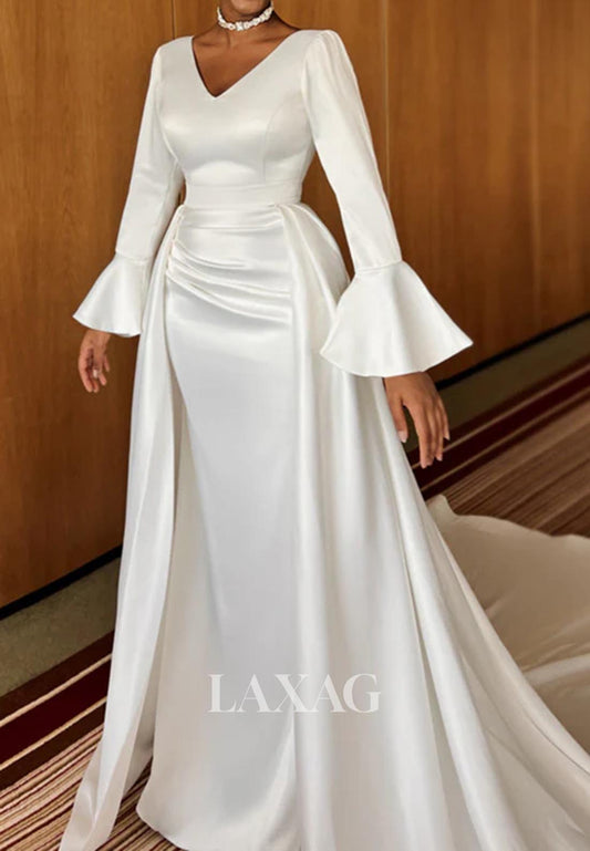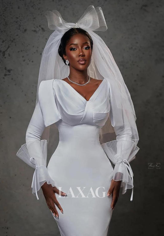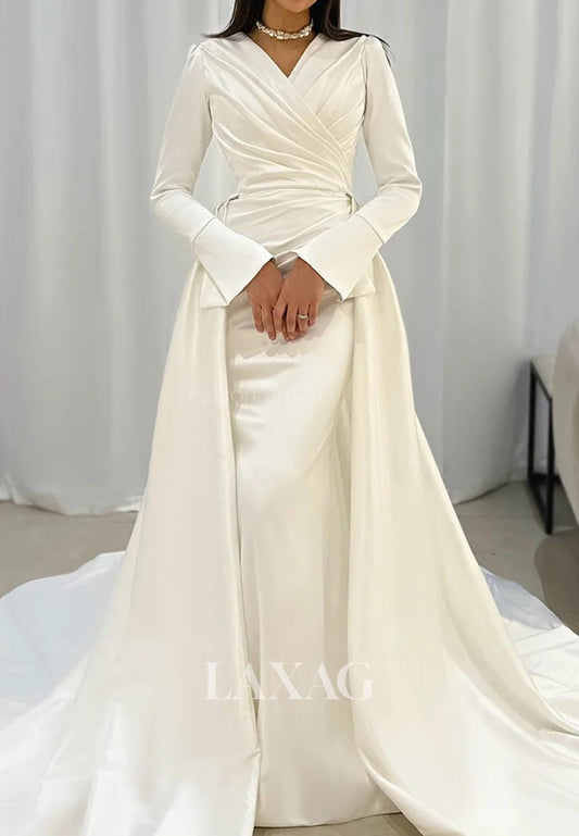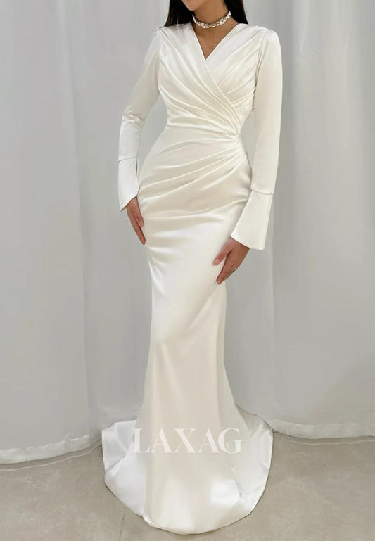 V-Neck Long-Sleeves Mermaid Wedding Dress Pleated Satin&Tulle Sweep Train Bride Gowns