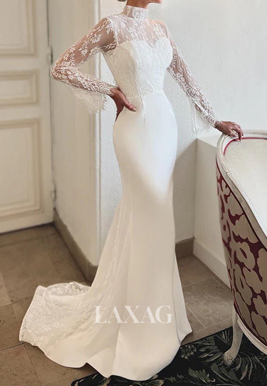 High-Neck Long-Sleeves Mermaid Wedding Dress Sheer Lace&Satin Bride Gowns with Sweep Train