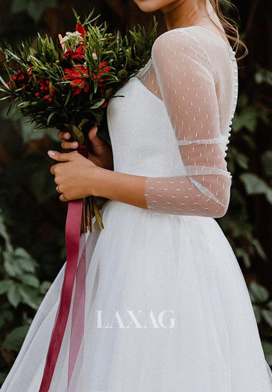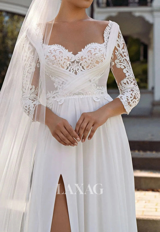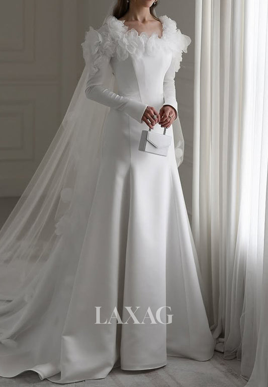 Square-Neck Long-Sleeves A-Line Wedding Dress Allover Lace Applique Pleated Sheer Bride Gowns