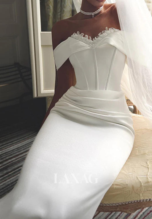 Sweetheart Off-Shoulder Bride Gowns Applique Pleated Satin A-Line Wedding Dress with Train