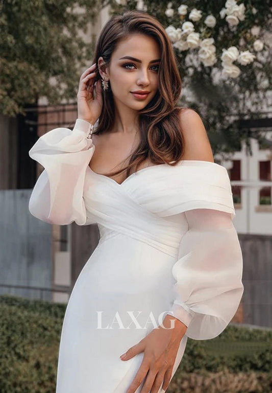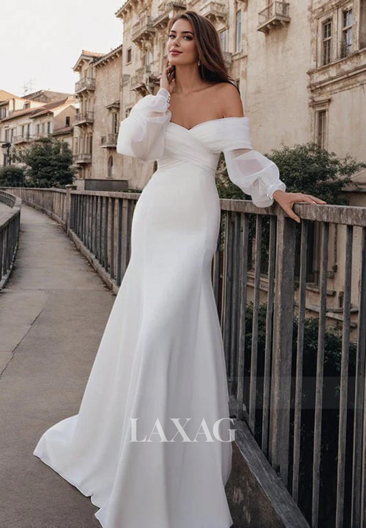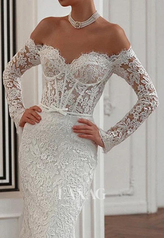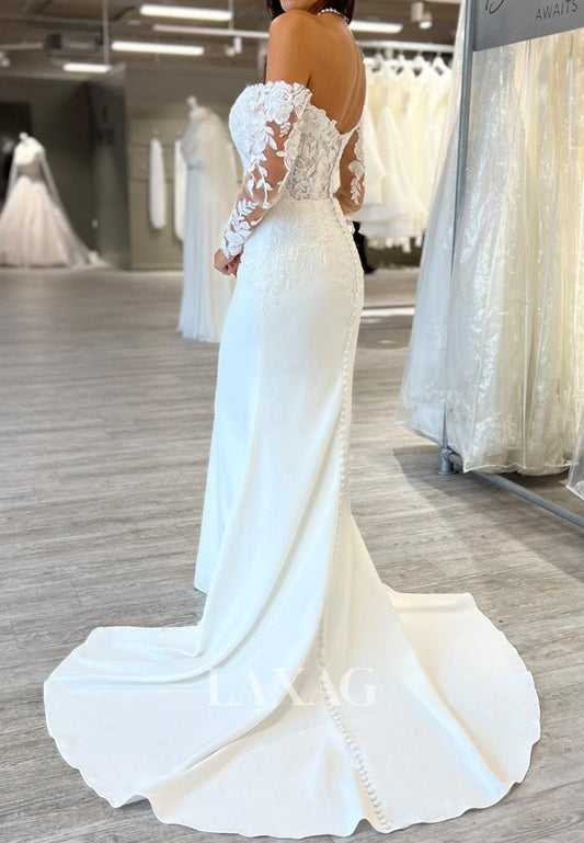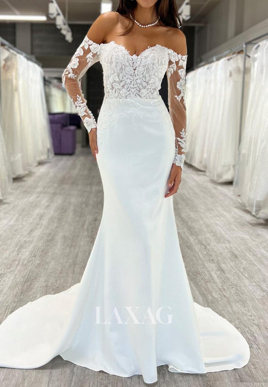 Off-Shoulder Lace Long-Sleeves Bride Gowns Sleek Satin Mermaid Wedding Dress with Train