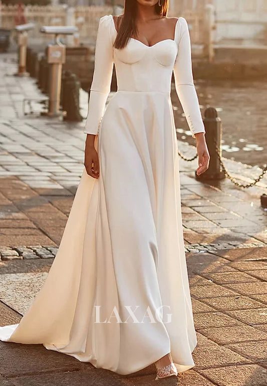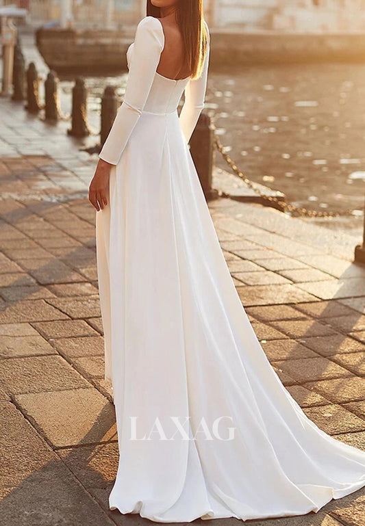Square-Neck Long-Sleeves A-Line Wedding Dress Allover Lace Pleated Sheer Bride Gowns with Train