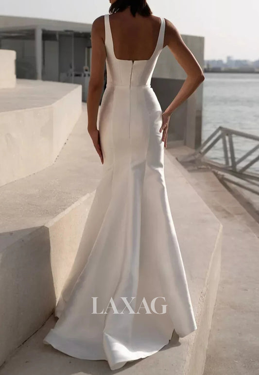 Square-Neck Sleeveless Straps Bride Gowns Off-Shoulder Sweep Train Satin Mermaid Wedding Dress
