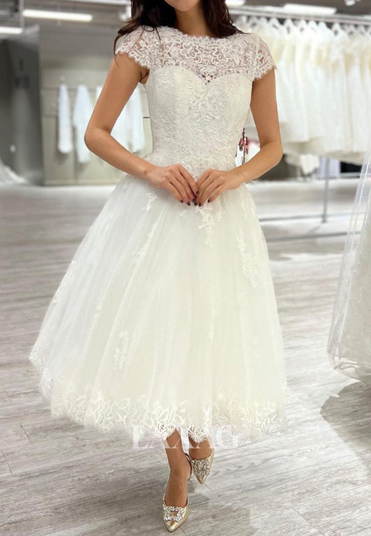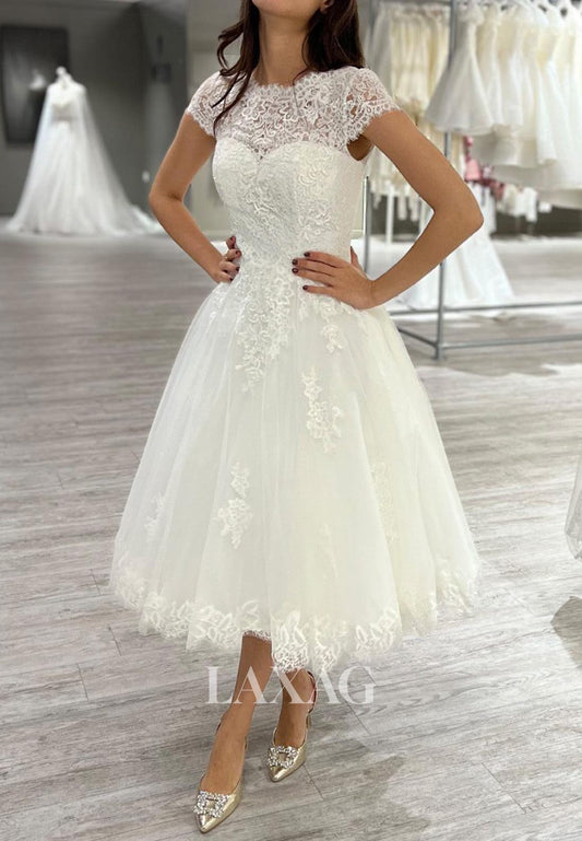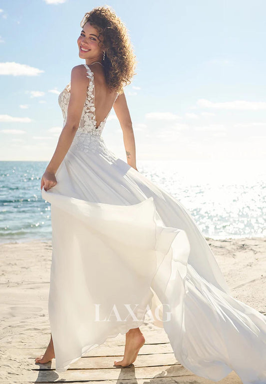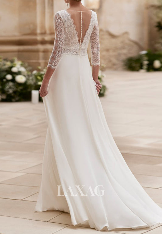 V-Neck Short-Sleeves Lace Backless Bride Gowns Chiffon A-Line Wedding Dress with Sweep Train