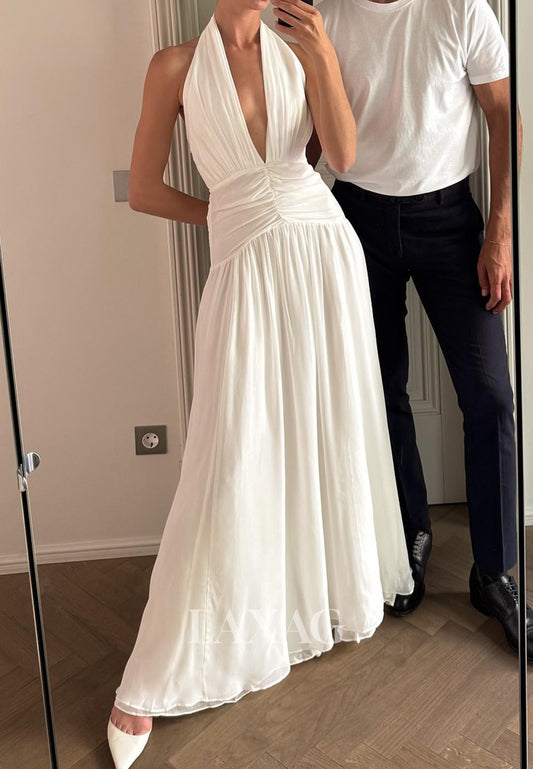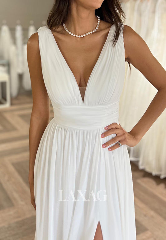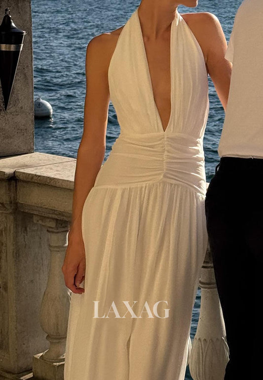 V-Neck Sleeveless Applique Pleated Chiffon A-Line Jumpsuit Wedding Dress