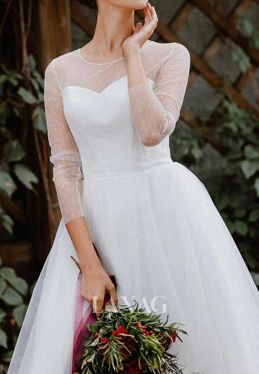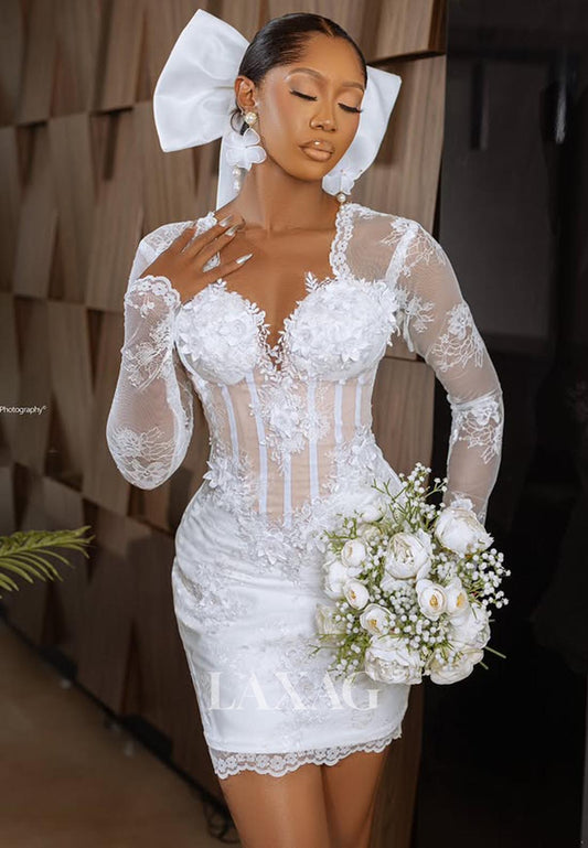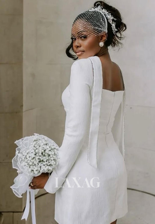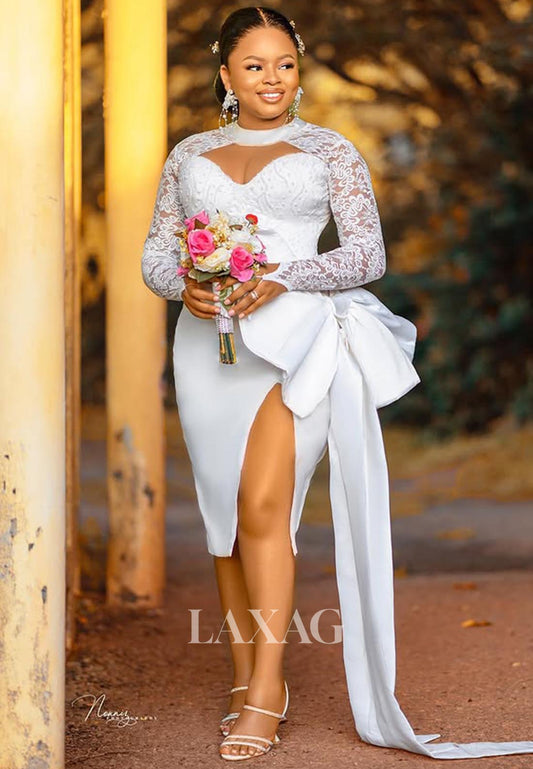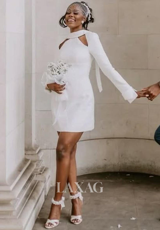 High-Neck Long-Sleeves Short A-Line Wedding Dress Applique Pleated Cutout Beach Wedding Dress