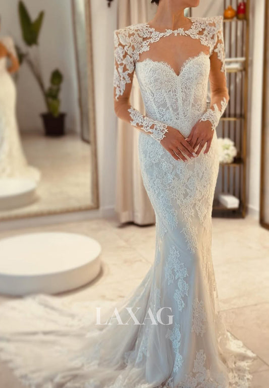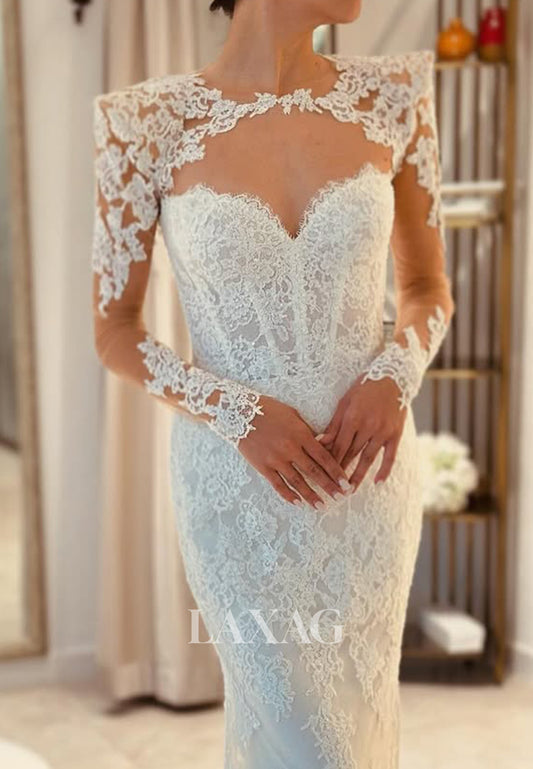 Sweetheart Long-Sleeves Sheer Bride Gowns Allover Lace Sweep Train Mermaid Wedding Dress